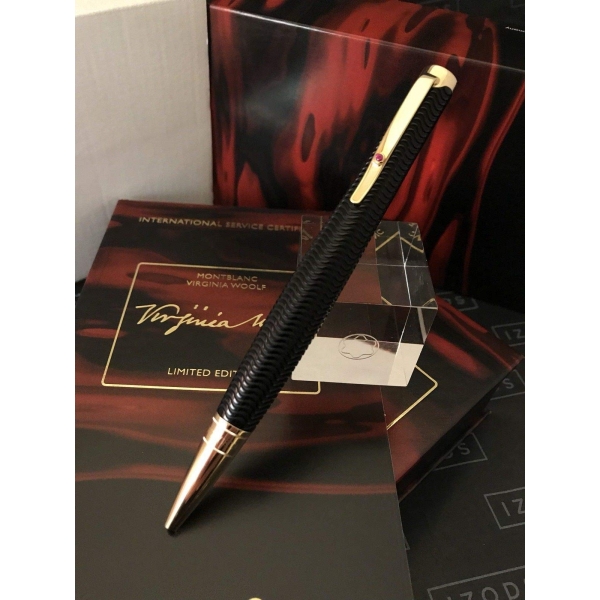 O corpo em resina preciosa preta apresenta acabamento em ondas, enquanto o clipe curvo é adornado por um rubi facetado — símbolo da intensidade criativa de Virginia Woolf. Os detalhes metálicos banhados a ouro reforçam sua aura de exclusividade. Cada exemplar é numerado, tornando-se não apenas um instrumento de escrita, mas um objeto de coleção.