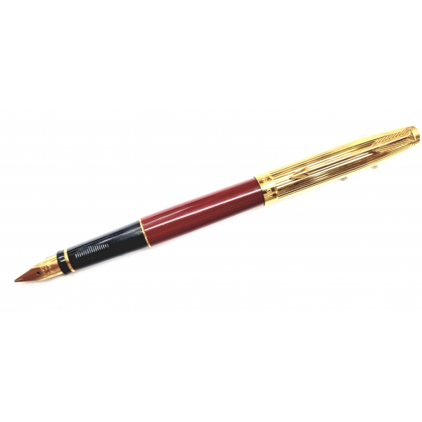 Caneta tinteiro Parker 75 Custom. Em laca, com a tampa folheada a ouro e a pena em ouro maciço.